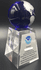 Crystal trophy with blue globe. Globe is 2-1/4 in diameter an attached to the base. 2-5/8 " x 5-1/4