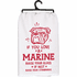 A cotton dish towel with red lettering and an "If You Love A Marine Raise Your Glass If Not Raise Your Standards" sentiment and a bulldog illustration. Machine-washable. Dimensions: 28" x 28" Material: Cotton