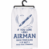 A cotton dish towel with red lettering and an "If You Love An Airman Raise Your Glass If Not Raise Your Standards" sentiment and a green army helmet illustration. Machine-washable. Dimensions: 28" x 28" Material: Cotton