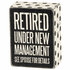 A classic black and white wooden box sign featuring a distressed "Retired - Under New Management - See Spouse For Details" sentiment with polka dot trim designs. Easy to hang or can free-stand alone.