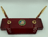 Other insignia, emblems and logos are available. Can be personalized. Call us or email us for details. Double pen set on a rosewood stained piano finish base. Size: 3-3/4" x 9"