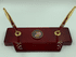 Other insignia, emblems and logos are available. Can be personalized. Call us or email us for details. Double pen set on a rosewood stained piano finish base. Size: 3-3/4" x 9"