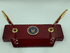 Other insignia, emblems and logos are available. Can be personalized. Call us or email us for details. Double pen set on a rosewood stained piano finish base. Size: 3-3/4 " x 9 "